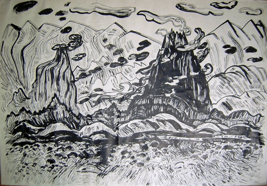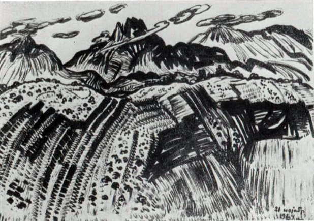 “Dağlar və buludlar” kağız, tuş, 70 x 100 sm, 1964